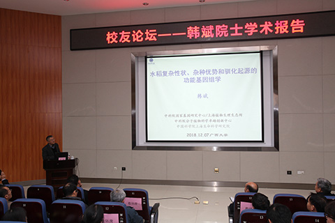 2018年12月7日下午,中国科学院院士,研究员,中国科学院国家基因研究中心主任,中科院上海生命科学研究院植物生理生态所所长韩斌院士应邀做客参加了我校90周年校友论坛的学术报告会,在国家重点实验室圆形报告厅作了题为《水稻杂种优势和驯化起源的功能基因组学研究》的学术报告,报告由冯家勋副校长主持。