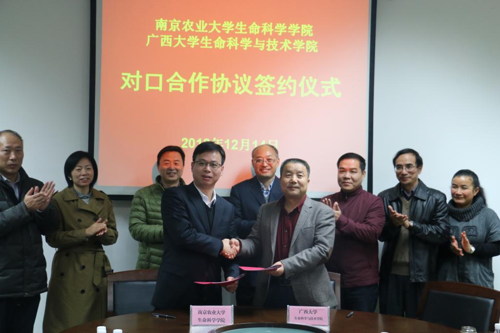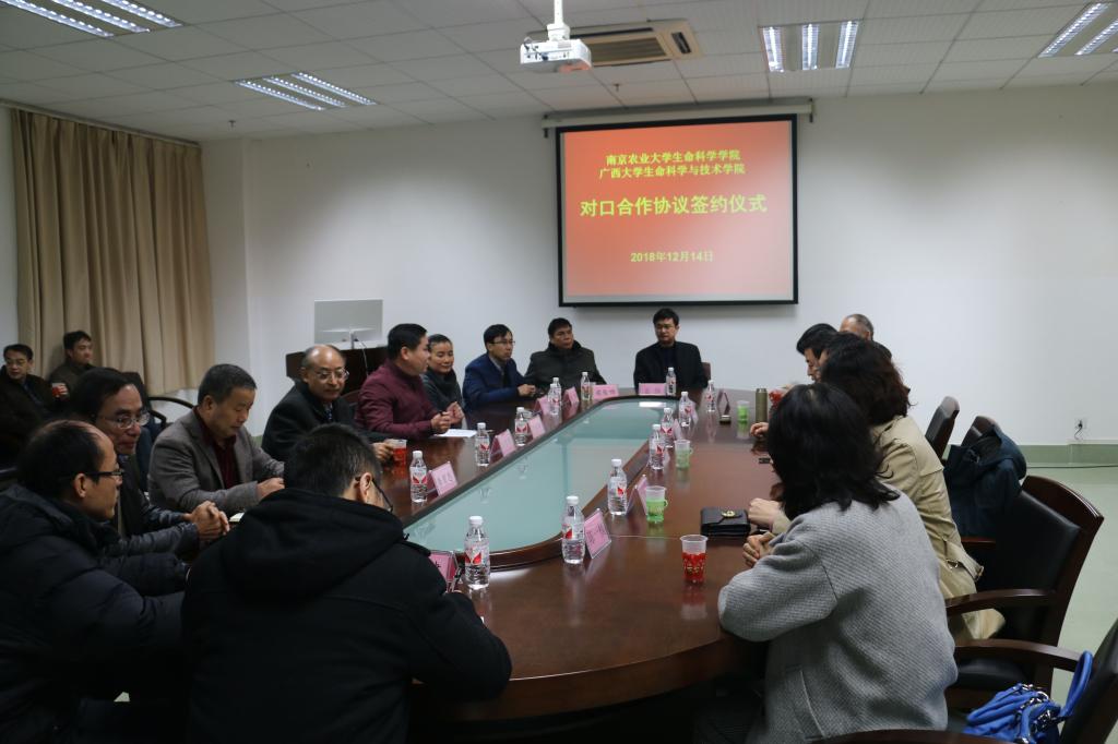 2018年12月14日下午,beat365在线唯一官网-南京农业大学生命科学院对口合作协议签约仪式在学院208会议室举行,南京农业大学生命科学院党委书记赵明文、副院长(主持工作)蒋建东一行、副校长、院长冯家勋、院领导班子其他成员、各系中心主任、副主任参加本次会议,会议由党委书记莫柏林主持。