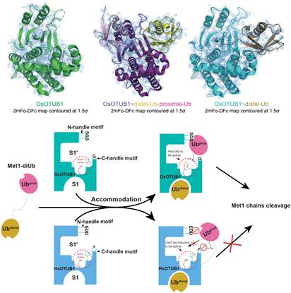 泛素-去泛素过程在动物、植物、微生物等多种生物中普遍存在,广泛参与包括炎症和先天免疫信号传导调控等基础生命过程。然而,目前关于植物中的Met1类型泛素链的去泛素酶的作用机制仍然不清楚。在该项工作中,我们创新性采用一锅法高效制备了携带脱氢丙氨酸的Met1-二泛素自杀型探针,发现了水稻源OTUB1(OsOTUB1)能够高效水解Met1类型泛素链。通过解析OsOTUB1、OsOTUB1~Met1-二泛素复合物、OsOTUB1~泛素复合物的晶体结构,我们发现Met1泛素链的水解活性(Met1活性)由OsOTUB1 S1'口袋中的Met1特异性基序N-handle motif和C-handle motif所决定的。有趣的是,这些基序在绿色植物中广泛保守但在后生动物中完全不存在,因此这一发现为在分类学上区分原始单细胞生物(无典型特征)为植物细胞还是动物细胞提供了全新的分子标准。