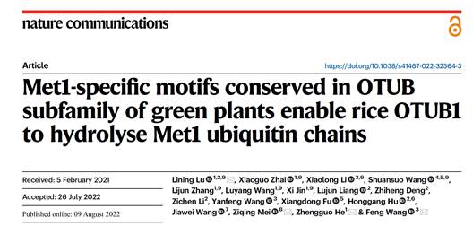 8月9日,我校beat365在线唯一官网、亚热带农业生物资源保护与利用国家重点实验室何正国教授领衔的合成生物学团队与北京理工大学和北京科技大学相关团队合作联合在国际著名学术期刊《自然-通讯》(Nature Communications)发表题为《绿色植物OTUB亚家族中保守的Met1特异性基序使水稻OTUB1能够水解Met1泛素链》(Met1-specific Motifs conserved in OTUB subfamily of green plants enable rice OTUB1 to Hydrolyse Met1 Ubiquitin Chains)的研究论文。广西大学为论文的第一完成单位和共同通讯作者单位。该工作在国际上首次揭示了水稻去泛素化酶OTUB1水解Met1泛素链的分子机制,发现了跨物种范围OTUB亚家族成员水解Met1泛素链的分子开关。