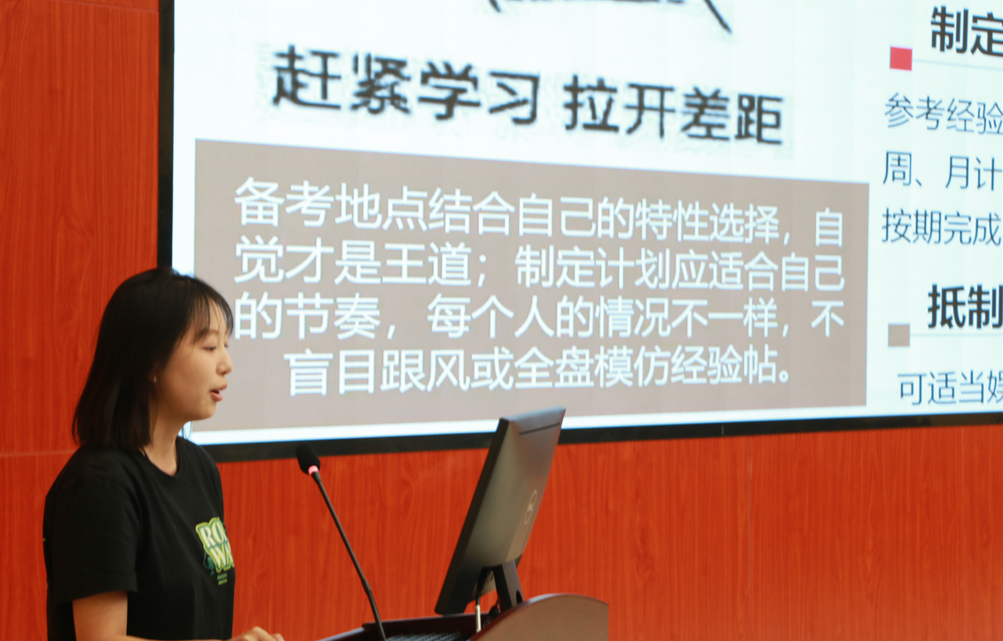 汤在行同学给同学们分析了掌上考研、教育部学位与研究生教育发展中心等获取信息的渠道,以了解目标院校的历年考研分数线、学科评估结果等情况,帮助同学们择校;并表示在考研的过程中一定要做个行动派,严格执行学习计划。