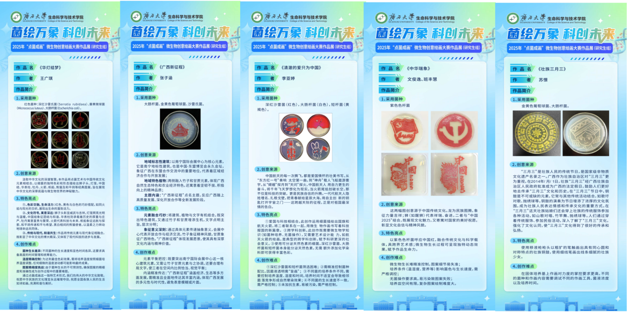 本届“点菌成画”微生物创意绘画大赛共收到223份参赛作品。各参赛队伍依托实验室提供的场地和条件,以非致病性微生物为颜料,在培养基上创作出一幅幅富有生命力的艺术作品,主题涵盖了青春梦想、人工智能、未来科技等多个方面,展现了生科学子对科学研究的热爱和对未来发展的无限憧憬。在这些参赛作品中,既有体现生物制造前沿理念的创新设计,也有歌颂祖国大好河山的美好画卷。经过最终评审,本科生组共评选出一等奖作品5项,研究生组共评选出一等奖作品41项。
