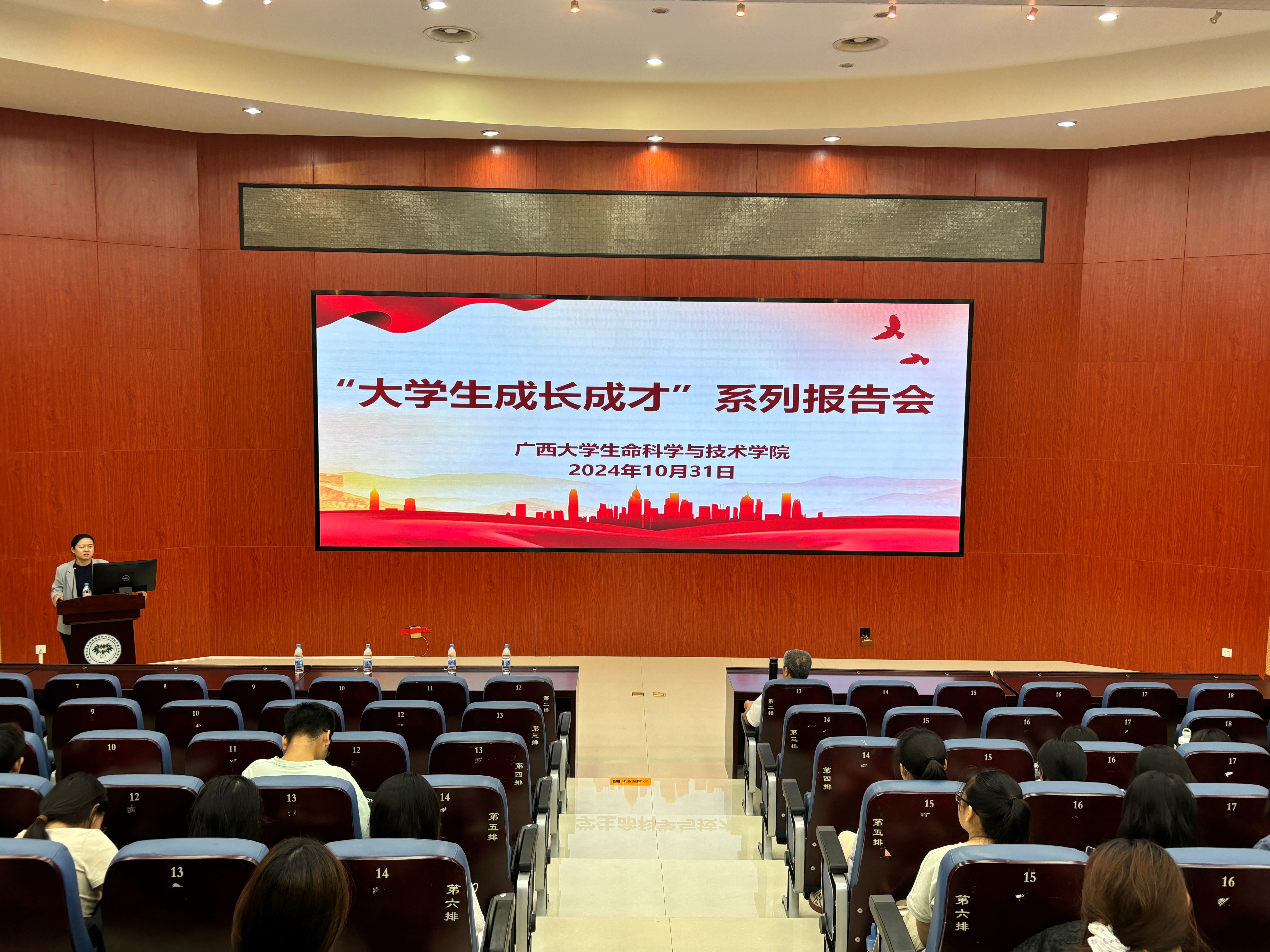 覃文月副书记在总结发言中指出,本次报告会为2024级新生提供了一次宝贵的学习机会,为同学们今后的成长道路提供了指导和启发。她勉励同学们要始终爱党爱国,厚植家国情怀,涵养浩然正气,勤于探索钻研,勇于攻坚克难,培养自律品格,提升能力素养,让实力驾驭目标、让才华撑起梦想,让青春在奋进新征程中绽放志存高远、百折不挠的绚丽之花。