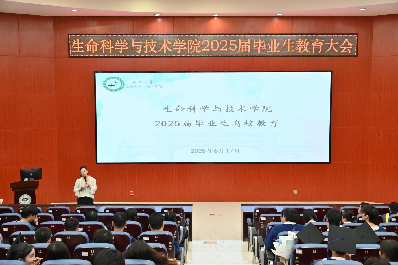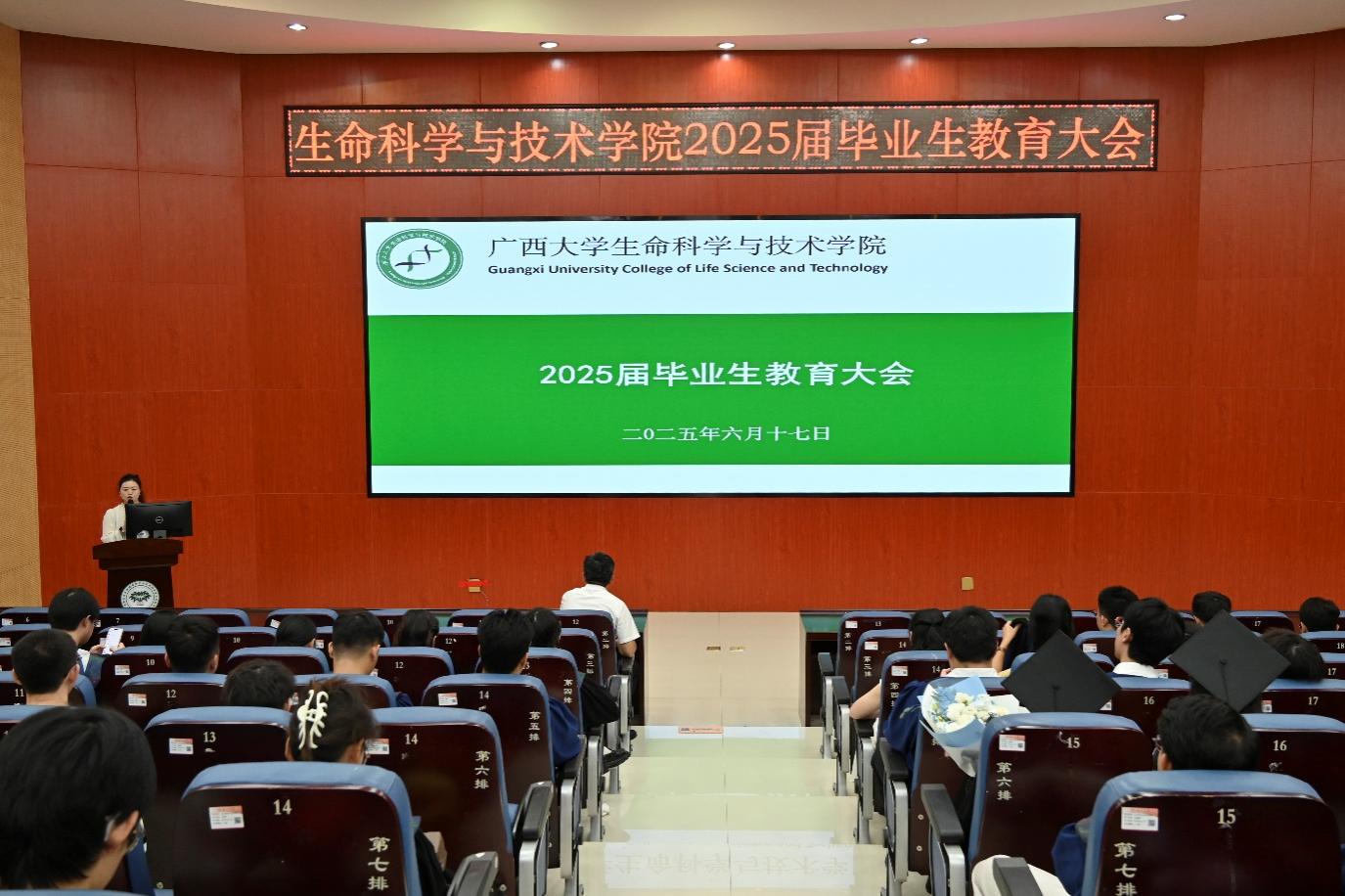 6月17日,我院在圆形报告厅举行2025届毕业生教育大会。学院党委书记刘培军、党委副书记覃文月、组织员韦世栋、团委书记马奕、辅导员贺超以及全体2025届毕业生参加会议。会议由团委书记马奕主持。